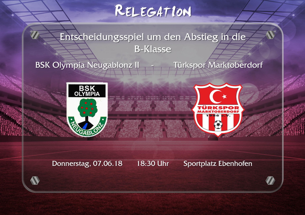Kurz nach dem letzten eigenen Saisonspiel der Saison 2017/2018 wird der 1. FC Biessenhofen-Ebenhofen zum Ausrichter eines Relegationsspiels ernannt. Um einen zusätzlichen Absteiger aus der A- in die B-Klasse zu ermitteln, treffen am Donnerstag, den 07. Juni 2018 der BSK Olympia Neugablonz II und Türkspor Marktoberdorf in Ebenhofen aufeinander.